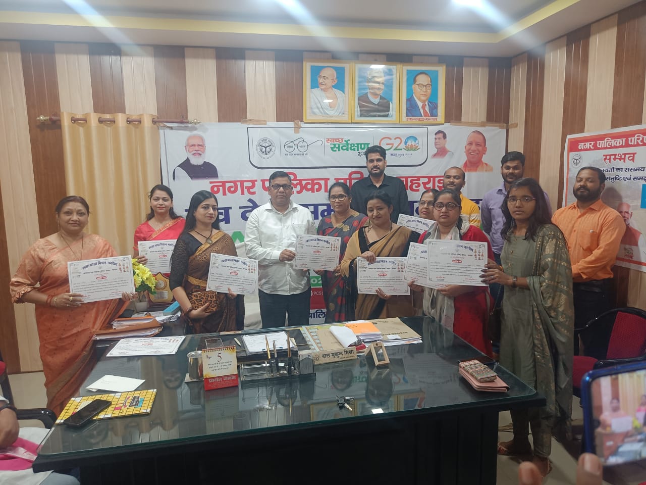 बहराइच। शासन के निर्देश के क्रम में स्वच्छ भारत मिशन नगरीय अन्तर्गत नगर पालिका परिषद बहराइच द्वारा 07 से 30 मार्च तक स्वच्छता उत्सव कार्यक्रम संचालित किया गया। यह जानकारी देते हुए अधिशासी अधिकारी नगर पालिका परिषद बहराइच बाल मुकुन्द मिश्र ने बताया कि स्वच्छता उत्सव कार्यक्रम के दौरान स्वयं सहायता समूह की महिलाओं द्वारा उत्कृष्ट कार्य करने वाली मॉ दुर्गा के नौ स्वरूपों वाली महिलाओं को नगर पालिका कार्यालय में प्रशस्ति-पत्र प्रदान कर सम्मानित किया गया। इस अवसर पर ई.ओ. श्री मिश्र, सफाई एवं खाद्य निरीक्षक अवनीश दुबे, सुरेश गोविन्द मिश्रा, डीपीएम गौतम मिश्रा, जिला समन्वयक लोकेश कुमार तथा नौ देवी महिलाओं में सुनीता यादव, रीता तिवारी, डॉ. अमृता, डॉ. अभिलाषा वर्मा, डॉ. ऊषा देवी व सीमा सहित अन्य सम्बन्धित मौजूद रहे।