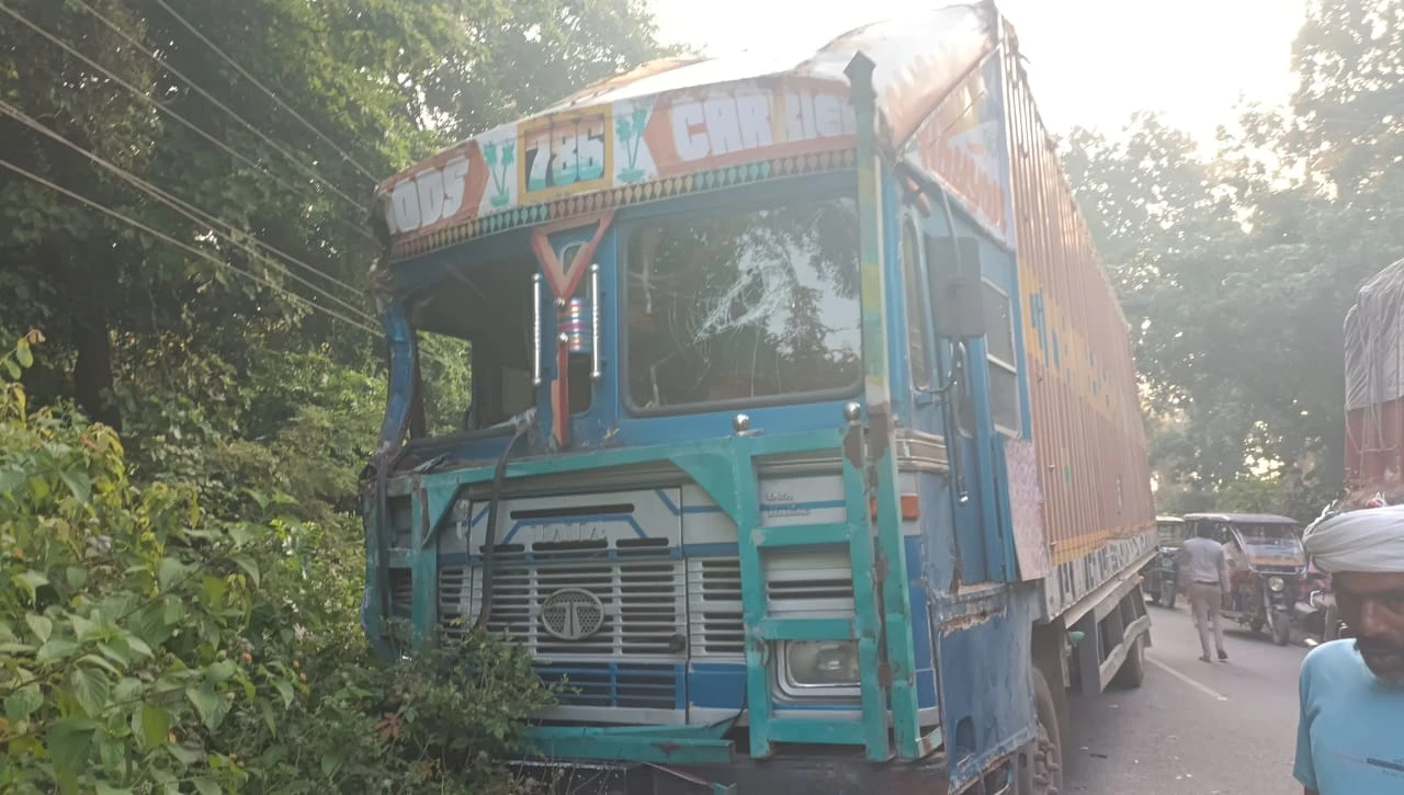 कन्टेन्सर व डीसीएम में भिड़न्त, चालकों को आयी मामूली चोटे : लखीमपुर-नानपारा हाईवे पर नैनिहा मंडी के पास हुई घटना