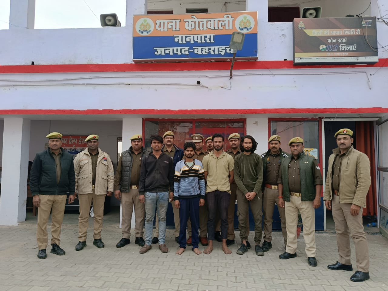 बहराइच। सराफा व्यवसायी के साथ हुई लूट का खुलासा करते हुए पुलिस ने चार शातिर अपराधियों को गिरफ्तार कर जेल भेज दिया है। आरोपियों के विरूद्ध पहले से ही कई थानों में मामला दर्ज है। गिरफ्तार आरोपियों में से तीन राजस्थान के निवासी है। ज्ञातव्य हो कि बीते 9 फरवरी की रात्रि करीब आठ बजे कोतवाली नानपारा के शिवालाबाग मेहरबान नगर निवासी सराफा व्यवसायी अमित सोनी पुत्र कृपा शंकर सोनी बोधवा बाजार में स्थित अपनी दुकान बंद कर वापस घर लौट रहे थे। तभी रास्ते में ककरी बंधे के निकट नहर पुलिया के पास बाइक सवार लुटेरों ने सराफा व्यवसायी पर चाकू से हमला कर घायल करते हुए बिक्री के नगद रूपये व सोने, चांदी के जेवरात लूट ले गए थे। जिसके संबंध में मुअसं. 63/24 धारा 394 के तहत मामला दर्ज किया गया था। घटना के बांद पुलिस विभाग में हड़कम्प मच गया था। एसपी व डीआईजी ने भी घटना स्थल का दौरान किया था व जल्द खुलासे के निर्देश दिए थे। मंगलवार को प्रभारी निरीक्षक नानपारा मिथलेश राय, प्रभारी एसओजी/सर्विलांस टीम द्वारा मुखबिर की सूचना पर लूट में शामिल अभियुक्त दीवान सिंह पुत्र विनोद सिंह निवासी उंचवा धौतलिया कोतवाली नानपारा, अंकित कुमावत पुत्र छित्रमल कुमावत निवासी सीएलसी चैक वार्ड नं. 39 थाना उद्योग नगर जनपद सीकर राजस्थान, कमलेश कुमावत पुत्र बनवारी लाल कुमावत निवासी जगदम्बा कालोनी, मो.हमराज पुत्र मो.हबीब शेख निवासी निकट आरटीओ आफिस तीनों जनपद सीकर राजस्थान को गिरफ्तार किया गया। अपर पुलिस अधीक्षक ग्रामीण डा.पवित्र मोहन त्रिपाठी ने बताया कि पकड़े गए लुटेरों के पास से 3 लाख 50 हजार रूपये के जेवरात, 25 हजार रूपये नगदी व लूट में प्रयुक्त बाइक, चाकू व मोबाइल फोन बरामद किया गया। पुलिस अधीक्षक द्वारा गिरफ्तार करने वाली पुलिस टीम को 20 हजार रूपये का नगद पुरस्कार देकर पुरस्कृत किया गया। गिरफ्तार आरोपी शातिर अपराधी है। पकड़े गए आरोपियों के विरूद्ध जनपद में पहले से ही कई मामले दर्ज है।