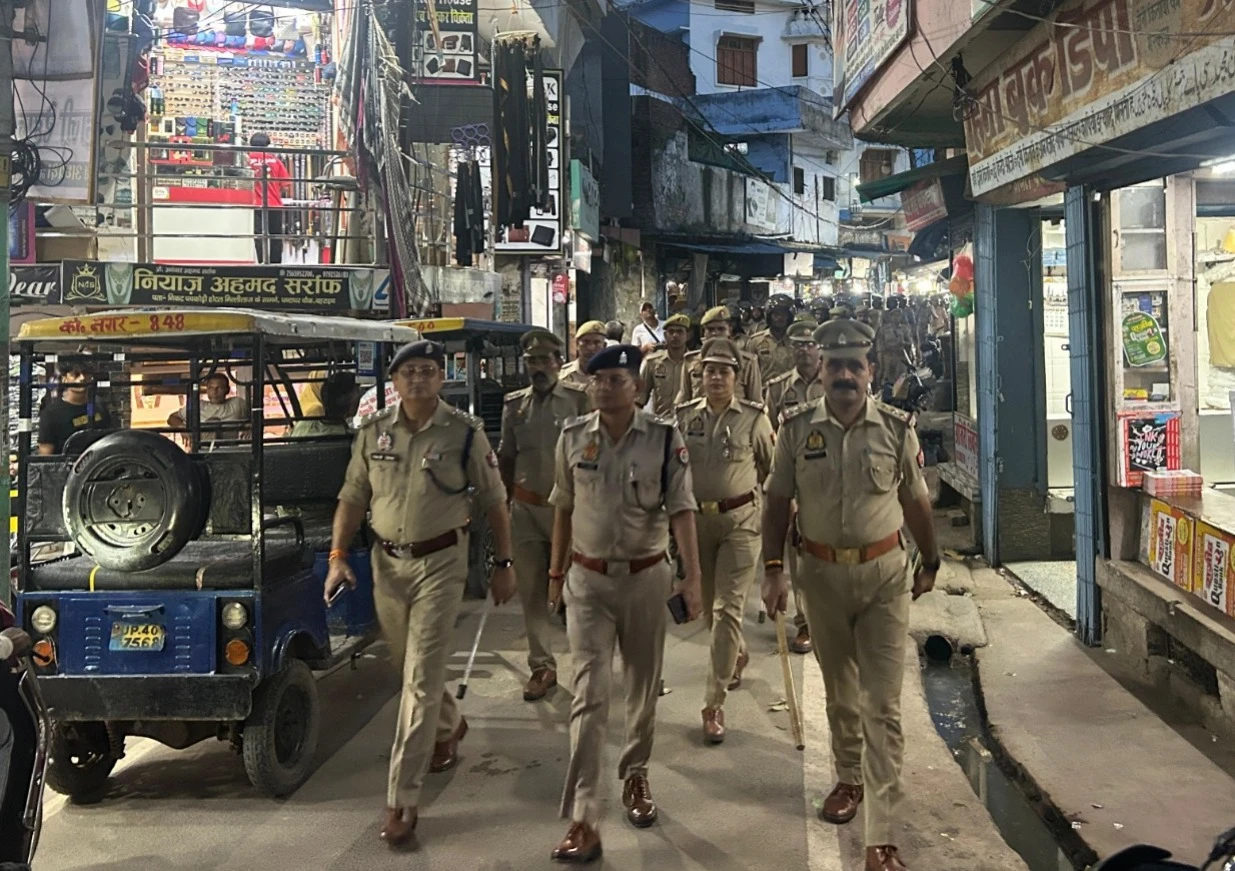 नगर में रूट मार्च कर कराया सुरक्षा का एहसास : एएसपी के नेतृत्व में पुलिस व पीएसी बल ने किया पैदल मार्च