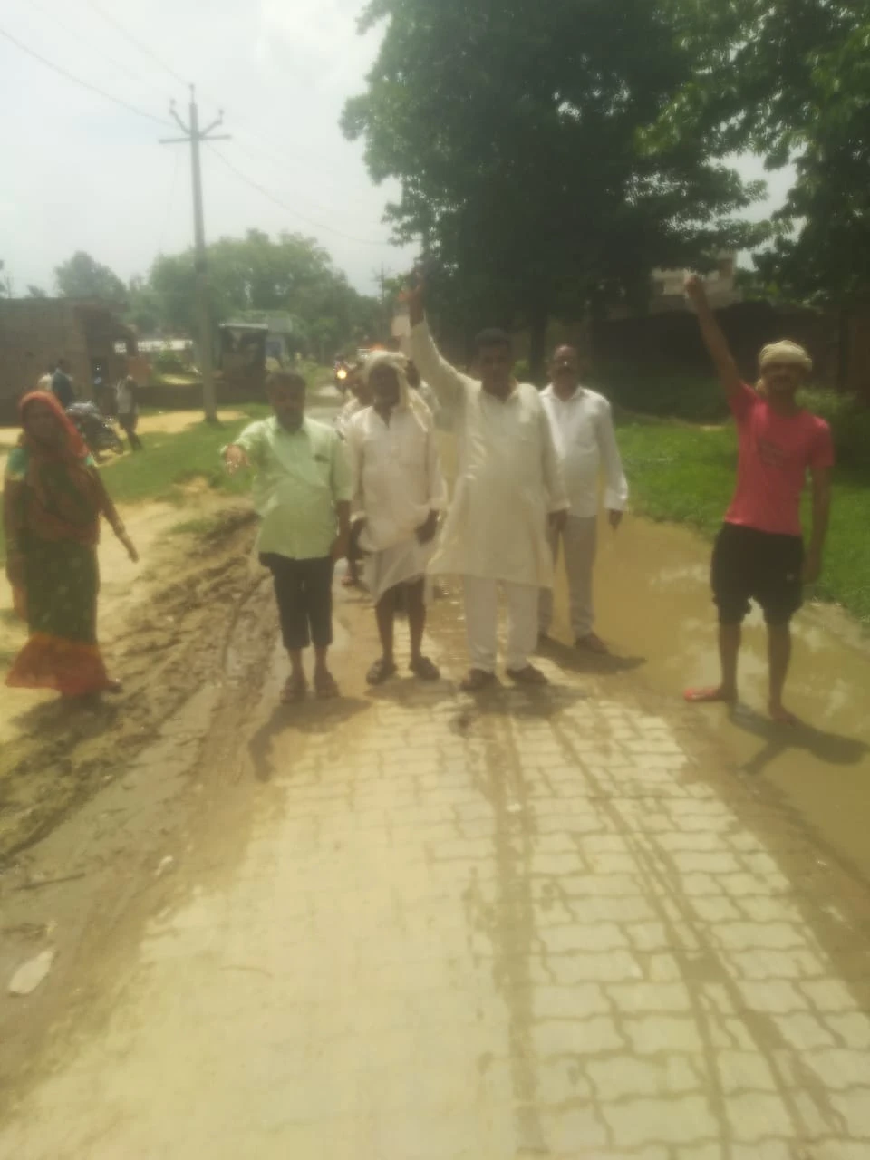 कांग्रेसियों ने पानी में खड़े होकर किया जल सत्याग्रह : ग्राम पंचायत हाजी विलायत में भारी जलभराव, दुर्दशा ग्रस्त सड़क मार्ग को जनहित में सुधार करने की मांग